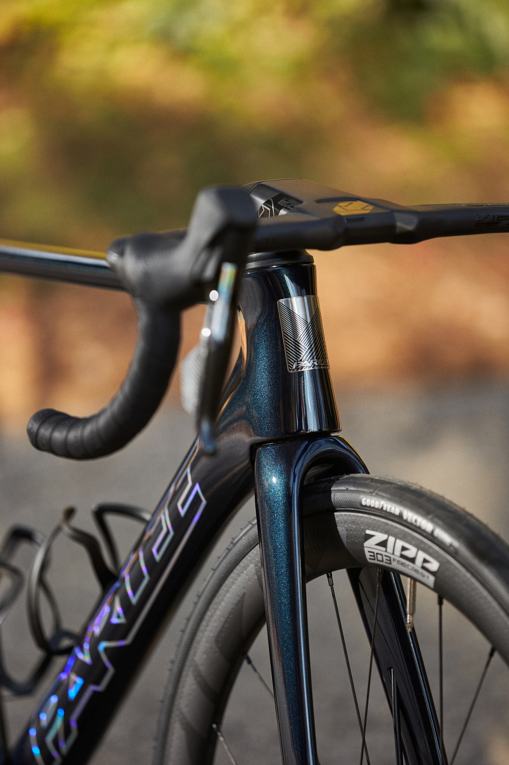 The Taos rolls out of the box with a perfect raw carbon finish, accented with pop‑of‑color Blue Haze decals.